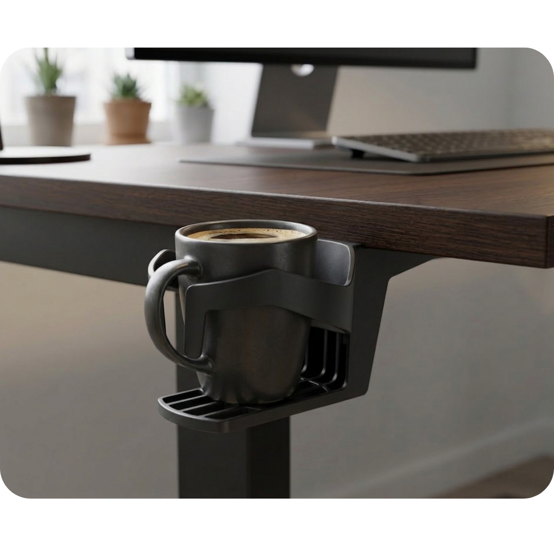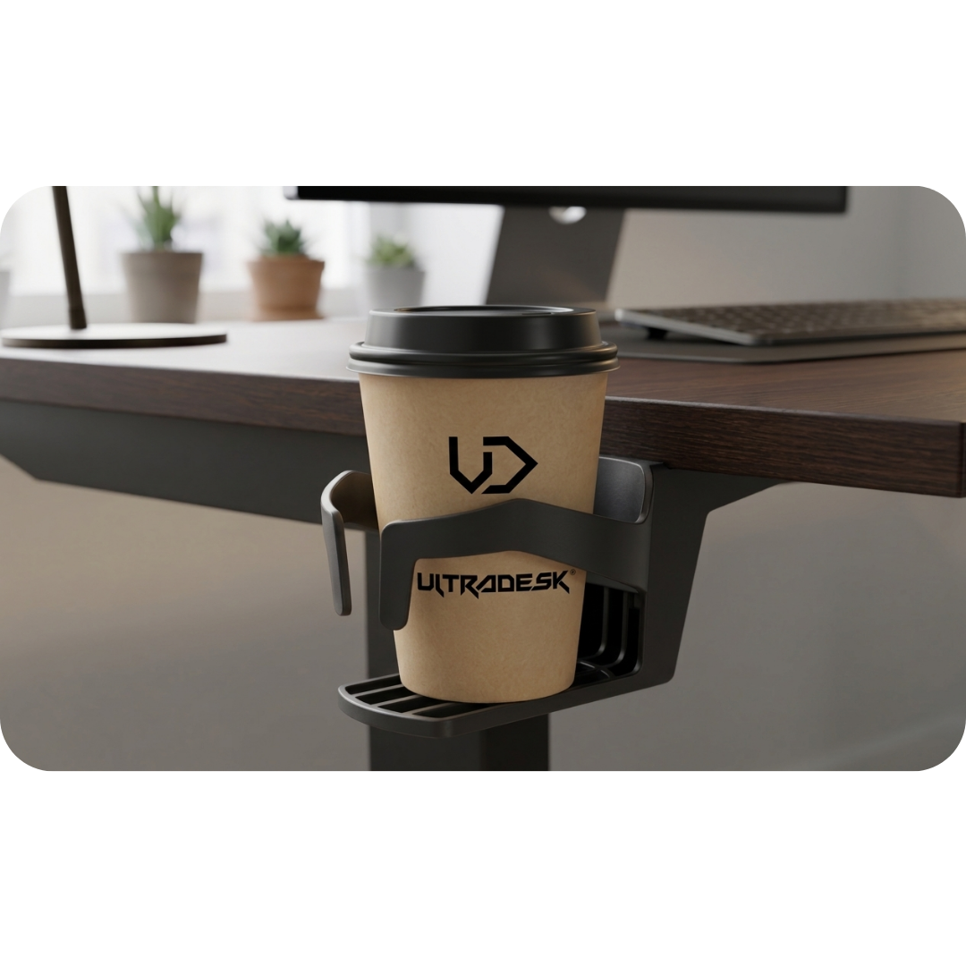 Platzersparnis: Durch das Auslagern des Getränks wird wertvoller Platz für Dokumente, Maus und Tastatur frei.