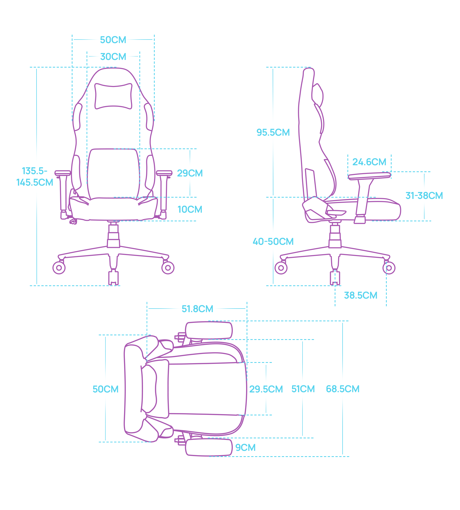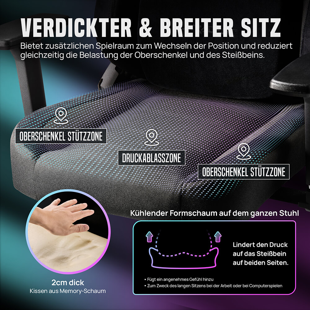 Die äußere Struktur dieses Computerstuhls basiert auf neuesten Forschungsergebnissen zur korrekten Körperhaltung bei der Computerarbeit am Schreibtisch. Die gesamte Sitzfläche ist ergonomisch geformt. Der Sitz wurde verstärkt und verbreitert, um maximalen Komfort zu bieten und dem Nutzer mehr Bewegungsfreiheit als die beengten Gaming Stühle auf dem Markt zu ermöglichen. Die Sitzform reduziert effektiv die Belastung von Oberschenkeln und Steißbein. Speziell geformte Oberschenkelauflagen sind beidseitig angebracht. Im Inneren des Sitzes befindet sich ein Kissen aus strapazierfähigem Memory-Schaum.