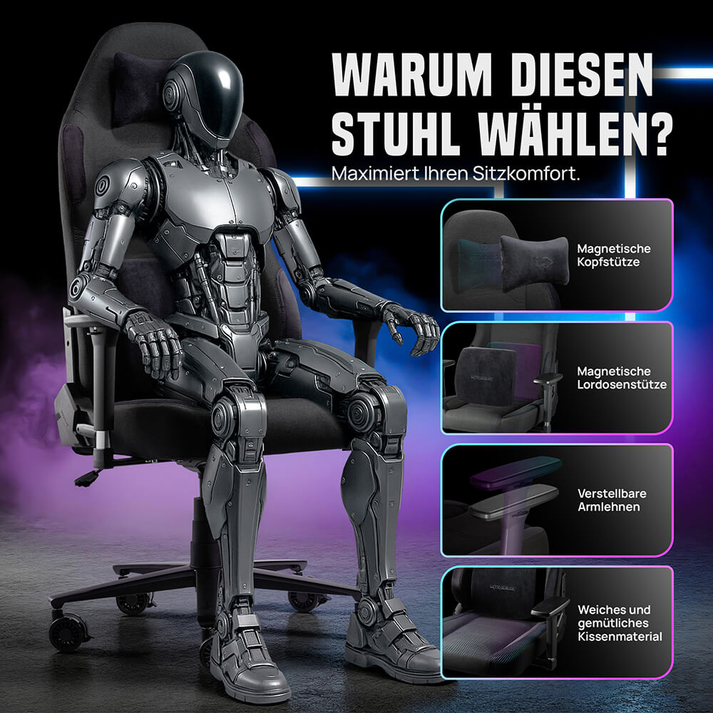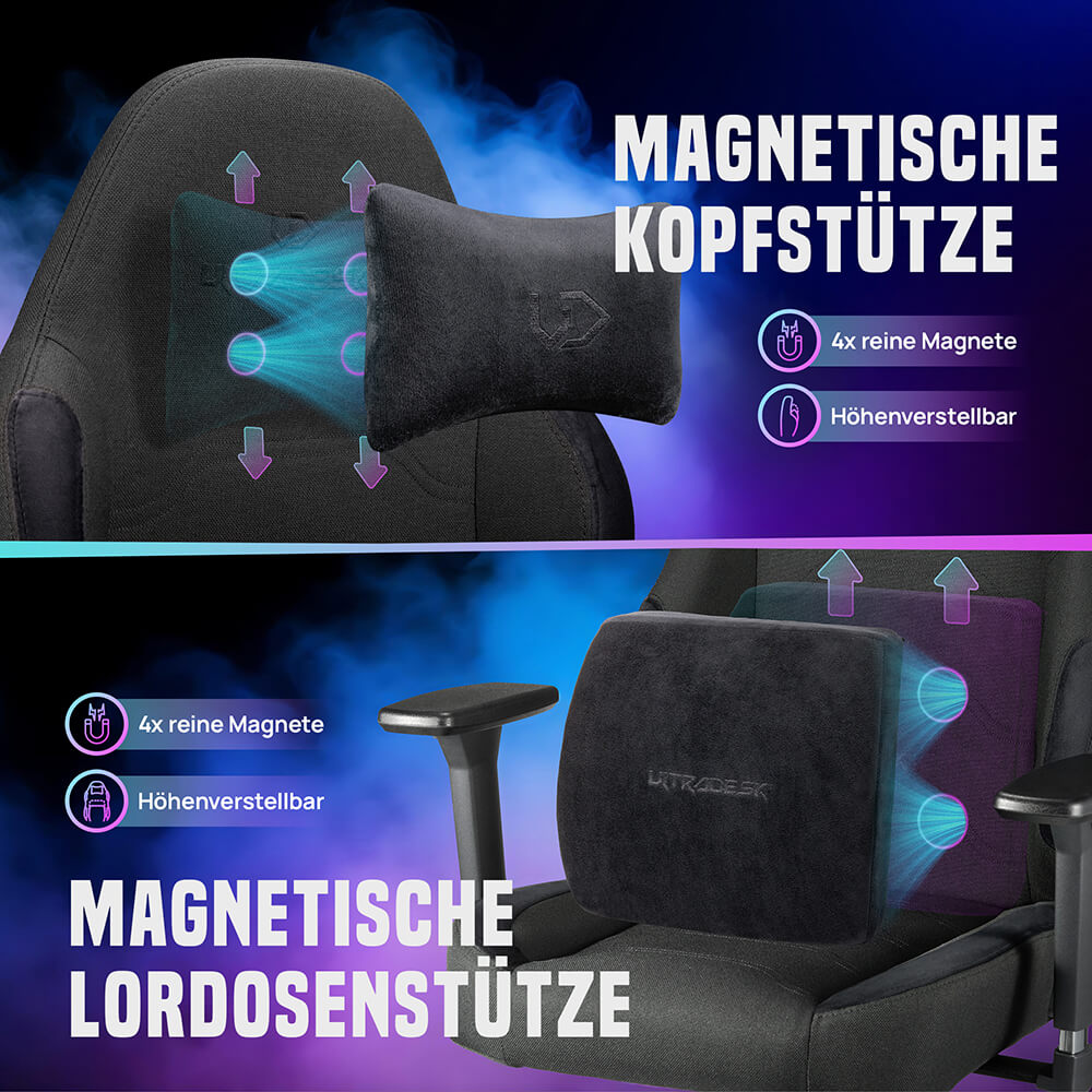 Dieses Möbelstück ist mit einer ergonomischen Kopfstütze und einer speziellen Lendenwirbelstütze ausgestattet. Beide Elemente werden mit starken Magneten befestigt und gewährleisten so eine schnelle und stabile Montage an der Rückenlehne des Stuhls. Sie sind zudem höhenverstellbar und lassen sich so optimal an die Körpergröße und -form des Nutzers anpassen. Die Kopfstütze trägt zu einer korrekten Körperhaltung bei, reduziert Nackenverspannungen und beugt Schmerzen vor. Beide Stützen sind in klassischem Schwarz gehalten und passen dadurch harmonisch zum Design des ULTRADESK OVERLORD Stuhls.