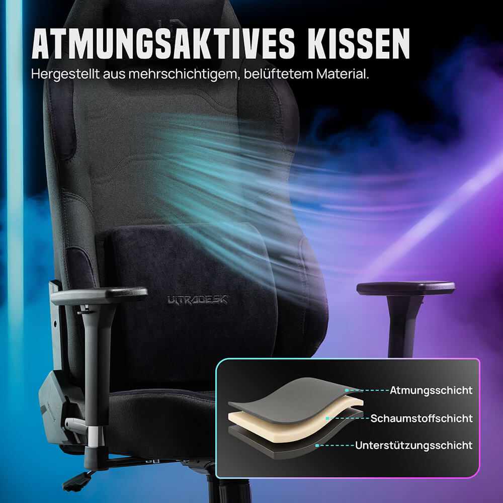 Die Rückenlehne besteht aus einem speziellen, mehrlagigen Polster, das maximalen Komfort bietet, gleichzeitig ergonomisch optimal ist und für eine effektive Belüftung sorgt. Die tiefste Stützschicht gibt der Rückenlehne ihre Kontur. Darüber befindet sich eine Schicht aus hochdichtem Memory-Schaum, die für lange Haltbarkeit sorgt. Die oberste Schicht ist aus strapazierfähigem Stoff gefertigt, der nicht nur optisch ansprechend ist, sondern auch die Belüftung verbessert. Der mehrlagige Bezug des Stuhls bewährt sich unter allen Bedingungen.