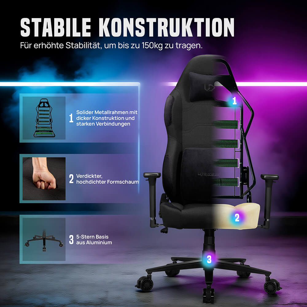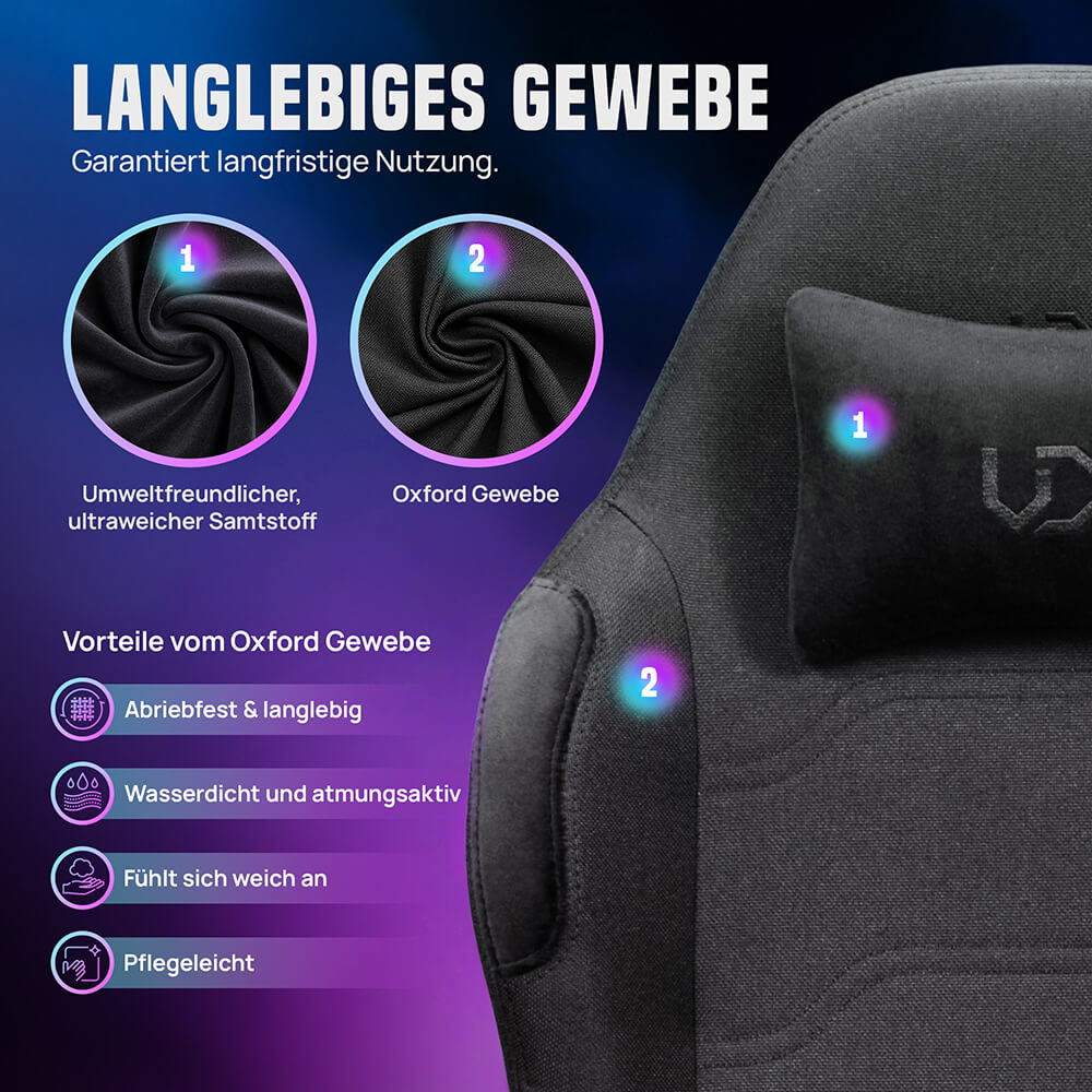 ULTRADESK OVERLORD ist ein moderner Computerstuhl, der technische und funktionale Vorteile mit hochwertigen Materialien perfekt vereint. Er bietet Höhenverstellung, eine verstellbare Rückenlehne, 3D Armlehnen und magnetische Kissen. Die dicke, breite Sitzfläche mit präziser Konturierung bietet viel Platz für verschiedene Sitzpositionen und entlastet gleichzeitig wichtige Körperpartien. Der stabile Stahlrahmen und das Aluminium-Fußkreuz sorgen für sicheren Stand, während die mehrlagige Polsterung die ergonomischen Eigenschaften des Stuhls optimiert. Der Bezug aus Oxford Gewebe behält sein makelloses Aussehen über Jahre hinweg und überzeugt durch seinen hohen Sitzkomfort.