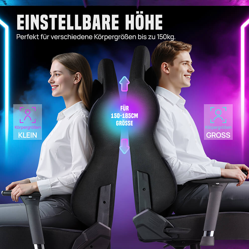 Dieses Produkt ist für Personen mit einer Körpergröße zwischen 150 und 185 cm und einem maximalen Gewicht von 150 kg konzipiert. Die richtige Höhenverstellung des Drehstuhls ist entscheidend für Ergonomie und die Gesundheit der Wirbelsäule. Sie ermöglicht eine neutrale und korrekte Körperhaltung und minimiert so das Risiko von Schmerzen und gesundheitlichen Problemen. Die korrekte Höhe sorgt für eine gleichmäßige Gewichtsverteilung und erhält die natürliche Krümmung der Wirbelsäule. Dadurch werden Muskelverspannungen im Lenden-, Brust- und Halswirbelsäulenbereich vermieden, die durch das Ausbalancieren einer schlechten Haltung entstehen können.