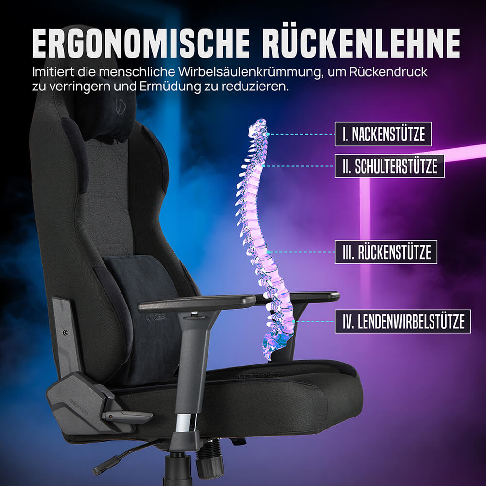 Die Rückenlehne ist der natürlichen Krümmung der menschlichen Wirbelsäule nachempfunden. Ihr Hauptzweck ist die Entlastung des Rückens und die Reduzierung von Ermüdungserscheinungen bei längerem Sitzen. Die Nackenstütze erhöht den Komfort und hilft, Nackenverspannungen zu lösen. Die Schulterstütze stabilisiert den Oberkörper. Unsere ergonomische Rückenlehne wirkt sich positiv auf den Komfort der gesamten Brustwirbelsäule aus. Die Lendenwirbelstütze ist entscheidend für den Erhalt der natürlichen Krümmung und die Unterstützung des unteren Rückens. Gesundheit und Komfort gehören zusammen!