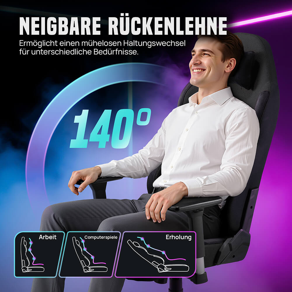 Die verstellbare Rückenlehne ermöglicht es Ihnen, Ihre Körperhaltung ganz einfach an Ihre Bedürfnisse anzupassen. Dank des großen Verstellbereichs ist der Stuhl vielseitig einsetzbar und ideal für verschiedenste Situationen. Ob Sie arbeiten, Videospiele spielen oder einfach nur entspannen möchten – mit dieser Rückenlehne finden Sie immer die perfekte Position. Die Rückenlehne des ULTRADESK OVERLORD Stuhls lässt sich bis zu 140 Grad neigen. Die Verstellung erfolgt bequem über einen Hebel an der rechten Seite.