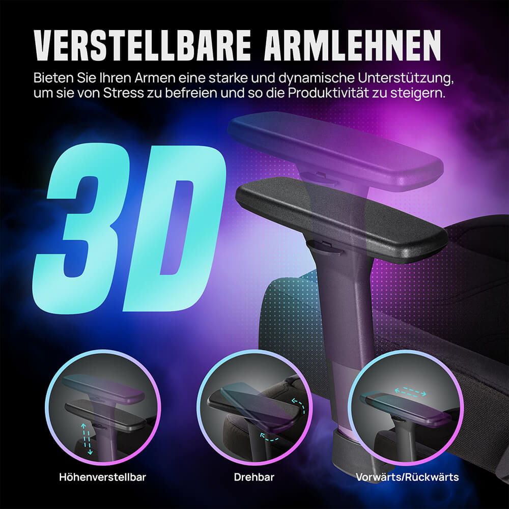 3D Armlehnen bieten drei Einstellmöglichkeiten und dienen primär der Steigerung der Benutzerproduktivität durch eine ergonomische Körperhaltung. Die 3D Verstellung ermöglicht die präzise Anpassung der Armlehnenposition an die Körperhaltung und die Schreibtischhöhe, was entscheidend zur Entlastung von Schulter- und Nackenmuskulatur beiträgt. Die Höhe lässt sich durch vertikales Verschieben nach oben oder unten anpassen. Die Schwenkfunktion ermöglicht die horizontale Bewegung des Armlehnenpolsters. Ein dritter Verstellmechanismus erlaubt die Vor- und Zurückbewegung des Polsters, um die Unterstützung an die Unterarmlänge und den Abstand zur Schreibtischkante anzupassen. Dank dieser drei Verstellmöglichkeiten (hoch/runter, schwenkbar, vor/zurück) verbessern 3D Armlehnen deutlich Ergonomie und Komfort bei längerem Sitzen.