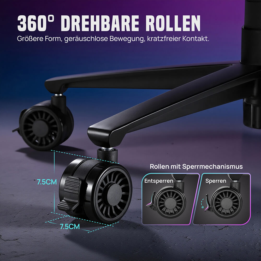 Das Set beinhaltet funktionale 360° Lenkrollen mit einem großen Durchmesser von 7,5 cm, die für hohe Beweglichkeit auf vielen Oberflächen und einen besonders leisen Lauf sorgen. Sie sind aus einem Material gefertigt, das auch unter starker Belastung bruchfest ist. Um den Stuhl in einer bestimmten Position zu fixieren, können Sie die praktischen Sperren nutzen, die sich bei Bedarf einfach wieder lösen lassen. Ein weiterer Vorteil dieser Rollen ist, dass sie empfindliche Bodenbeläge nicht zerkratzen.