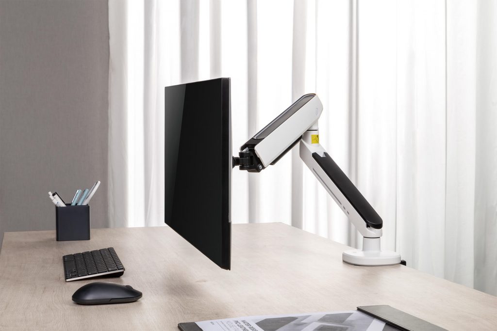 Das Hauptelement der Halterung ist ein Schwenkarm aus Aluminium, mit dem Sie den Monitor im Raum um volle 360 Grad um die eigene Achse bewegen können. Er wurde aus einer haltbaren und starken Metalllegierung hergestellt. Seine äußere Oberfläche wurde mit einer ästhetischen Beschichtung ergänzt. Der verwendete Mechanismus ist sehr zuverlässig und erfordert keine zeitaufwändige Wartung, um seine volle Funktionalität aufrechtzuerhalten.