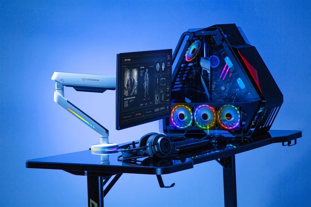 Sie können ULTRADESK OFFSHOOT mit einer der beiden verfügbaren Methoden montieren. Mit der ersten können Sie die Struktur an der hinteren oder seitlichen Kante Ihres Computertisches befestigen. Der zweite Weg ermöglicht die Montage in Durchgangslöchern, die oft ein integraler Bestandteil von Desktops in Computertischen sind. Diese Lösung macht das Produkt noch universeller und gibt dem Benutzer mehr Möglichkeiten bei der Gestaltung einer Spielstation.