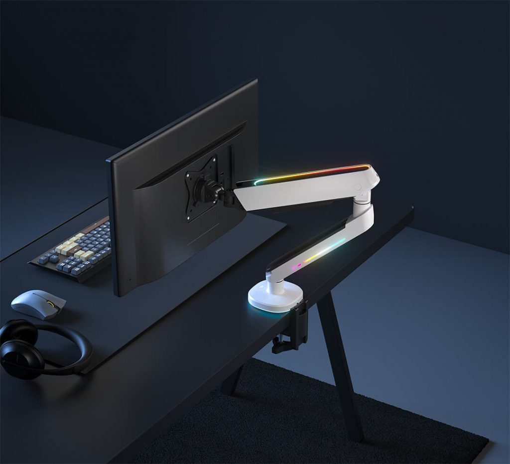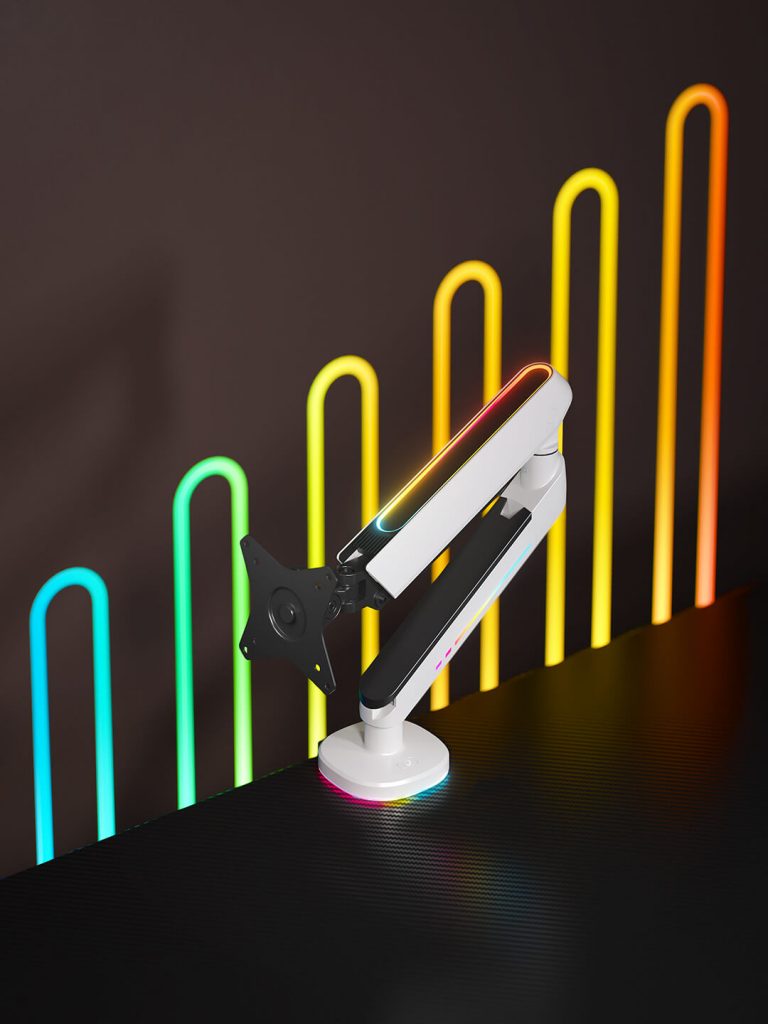 Der Arm ist mit einer speziellen weißen Schutzschicht überzogen. Sie schützt die wichtigsten Elemente der Monitorhalterung vor Beschädigung und übermäßiger Feuchtigkeit. Darüber hinaus hat sie einen erheblichen Einfluss auf das einzigartige äußere Erscheinungsbild des Produkts. Die Beschichtung besteht aus strapazierfähigem Material.